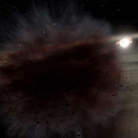 Чтобы образовалось такое обширное облако, объекты, участвовавшие в столкновении, должны были быть размером с карликовые планеты — ну или по крайней мере с Весту. Само столкновение привело к выделению большого количества тепловой энергии, это должно было немедленно привести к частичному испарению вещества астероидов. Это вызвало также цепную реакцию дальнейших соударений между фрагментами расколовшихся от первого столкновения планетезималей и других небольших тел в этой звездной системе, что, собственно, и породило в конце концов все то невероятное количество пыли, что наблюдал Spitzer.