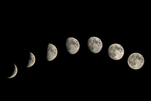 Каждый лунный цикл (синодический месяц — от Новолуния до Новолуния) длится 29-30 дней и состоит из 8 фаз. Четыре из них — основополагающие статичные точки, задающие ритм (Новолуние — Первая четверть — Полнолуние — Последняя четверть), другие четыре фазы — динамичные периоды растущей и убывающей Луны, каждый длительностью примерно в одну неделю.