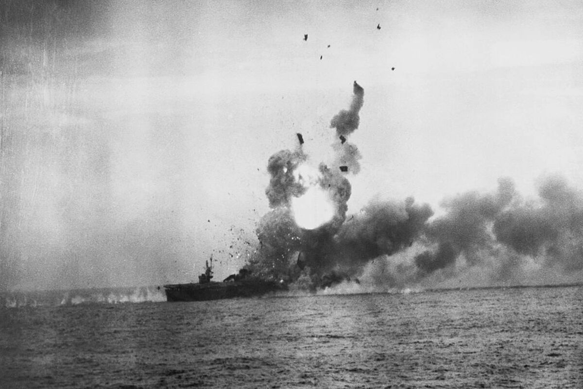 Взрыв эскортного авианосца St. Lo после попадания камикадзе