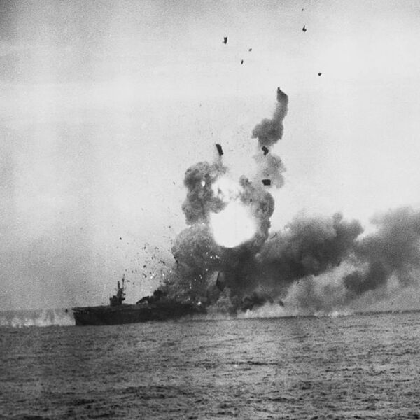 Американские пикирующие бомбардировщики (слева внизу) атакуют японские авианосцы