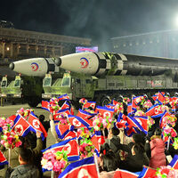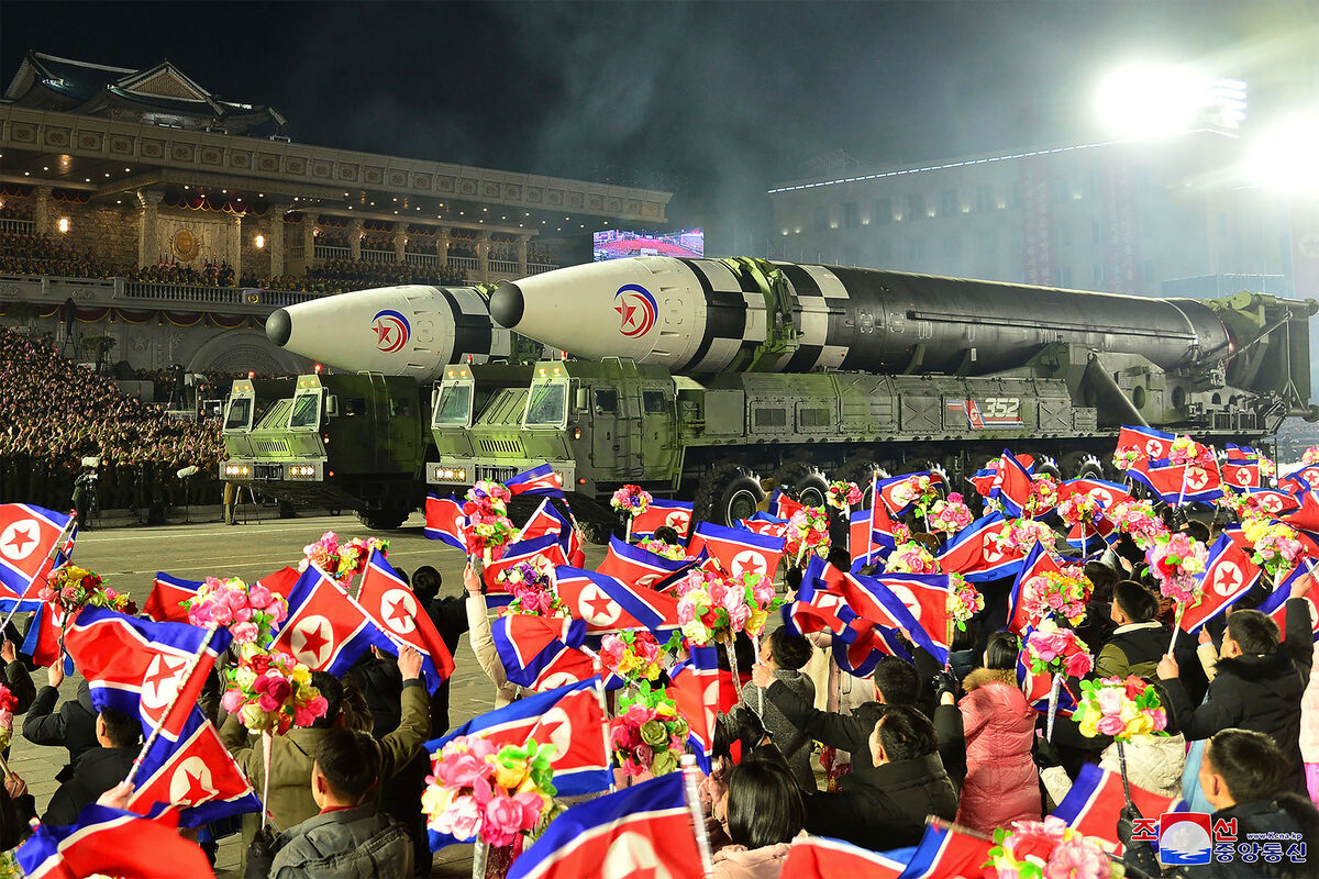 Межконтинентальные баллистические ракеты Hwasong-17 во время военного парада в честь 75-й годовщины основания Корейской народной армии на площади Ким Ир Сена в Пхеньяне, КНДР
