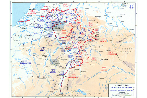 Результат не заставил себя ждать. 1 апреля, на католическую пасху, наступавшие с юга и с севера части соединились в районе Падерборна, в 140 км от Рейна. Идея с «крепостью» тоже прогорела: поскольку вжатые в землю и лишенные топлива немецкие войска не могли маневрировать, англичане и американцы выделили не слишком большие силы на блокаду и продолжили наступление на восток, навстречу Красной армии, движущейся к Эльбе.