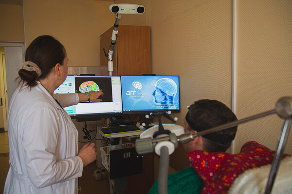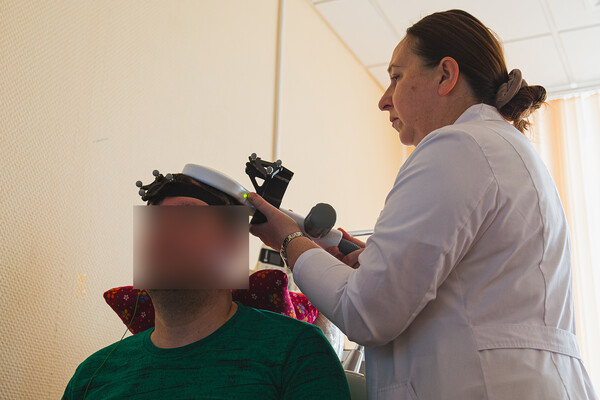 «Мы надеваем на голову специальные метки и через систему распознавания головы строим 3D-модель. На эту модель накладывается зона, которая откартирована в головном мозге. На эту зону воздействует сфокусированное магнитное поле — до этого мы смотрим, на какую именно плотность магнитного поля реагирует данный пациент. Это считается амплитудой стимуляции. Эту амплитуду стимуляции мы уже вносим в протокол лечения. То есть получается, каждый протокол индивидуальный» — рассказала Базуева.