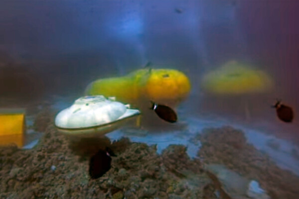 Рядом с главным зданием находился гараж для тарелки-субмарины, в который она заходила, подныривая под открытое дно. Ниже, на глубине 25 метров, располагалось еще одно жилище, предназначенное для кратковременных визитов. Все постройки были связаны между собой с помощью телефонных и телевизионных линий. Вели они и на поверхность, где дежурили два судна, «Калипсо» и «Росальдо». Они служили источником энергии, а также нагнетали по шлангам воздух, поддерживая давление в две атмосферы.