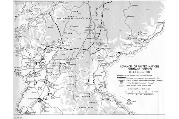 В итоге осенью северокорейская армия была дезинтегрирована и на какое-то время перестала существовать как организованная сила. Это позволило войскам ООН не только отбить Южную Корею, но и перейти на территорию Северной и к середине октября зажать ее на узкой полосе в горах, у границы с коммунистическим Китаем. По сути, Ким Ир Сен был в шаге от объединения страны, ради которого он войну и начал, — только произошло бы это не под тем флагом, под которым он хотел.
