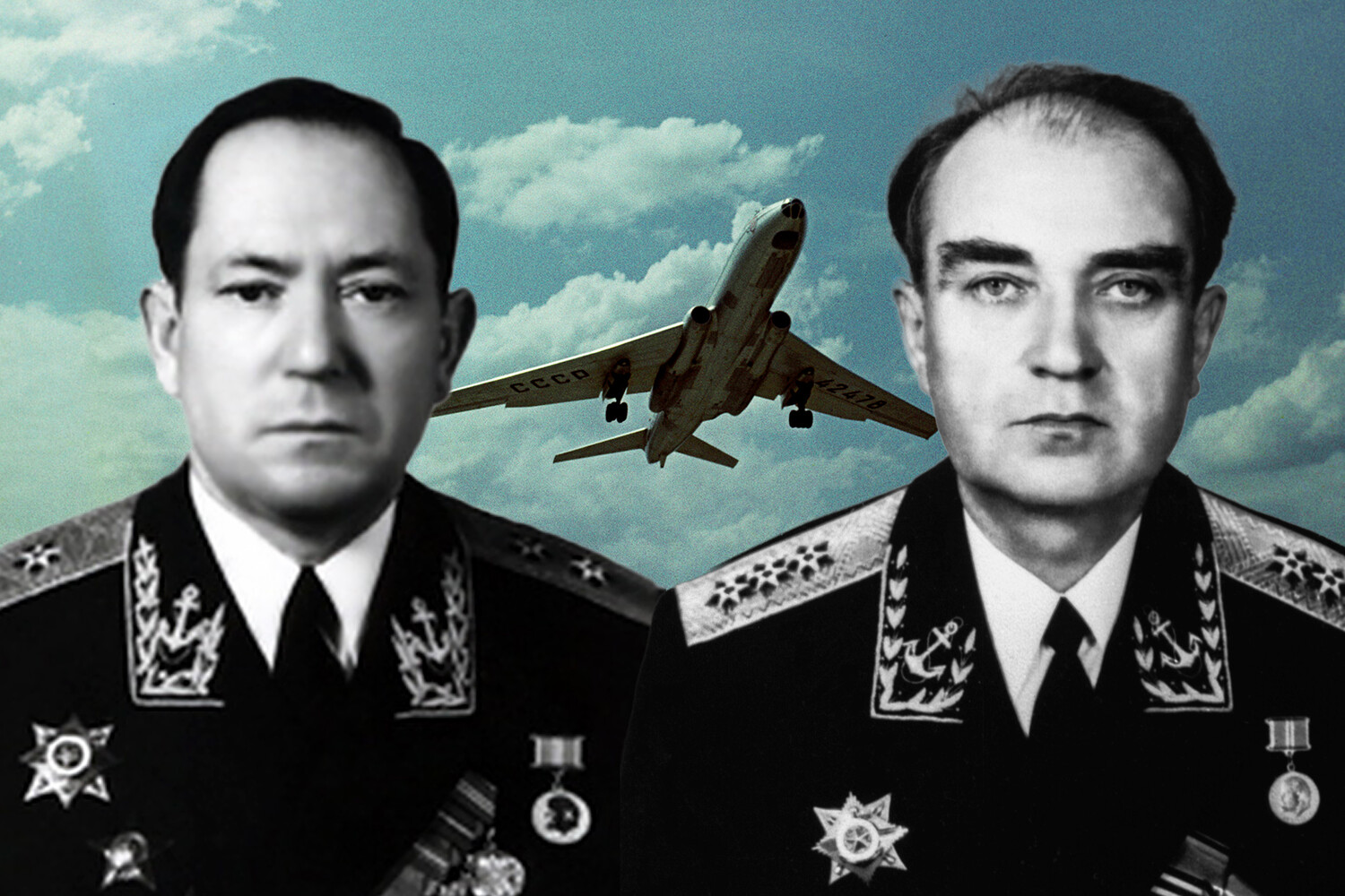 Командующий 4-й флотилией подводных лодок ТОФ, вице-адмирал Виктор Григорьевич Белашев и Командующий Тихоокеанским флотом, адмирал Эмиль Николаевич Спиридонов на фоне самолета Ту-104 (коллаж)