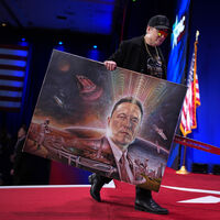 Генеральный директор Tesla и SpaceX Илон Маск уносит картину, подаренную ему одним из зрителей, после выступления на Конференции консервативных политических действий (CPAC) в отеле и конференц-центре Gaylord National Resort Hotel And Convention Center в Оксон-Хилле, штат Мэриленд, 20 февраля 2025 года