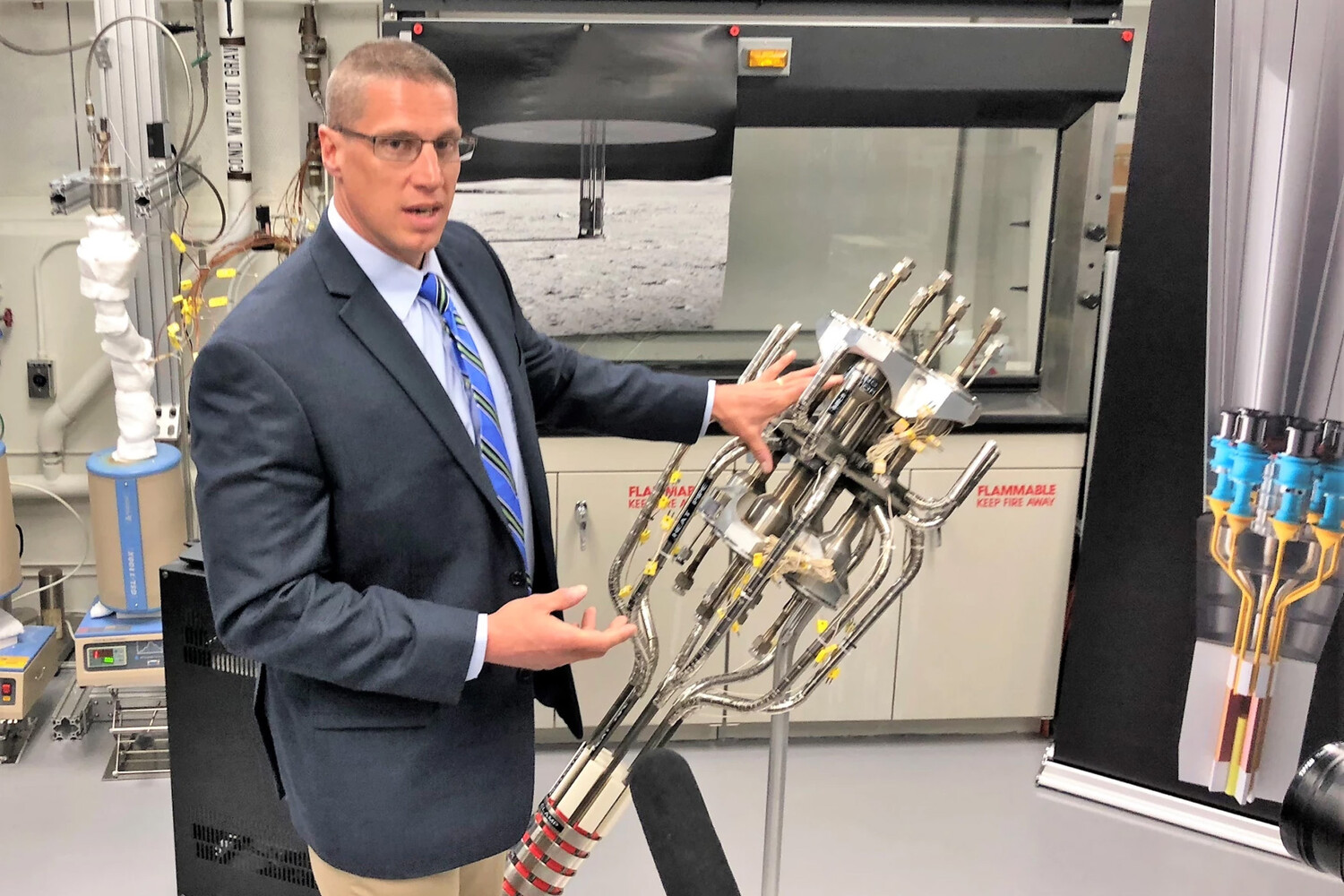 Ключевой компонент Kilopower — активная зона с системой охлаждения и генераторами Стирлинга, преобразующими разницу температур в электричество. На заднем плане виден рисунок готовой системы в конфигурации для работе в вакууме