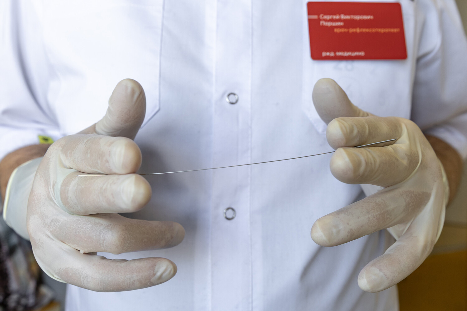 У меня проблема самая распространенная – шея. Я сажусь на стул, и Паршин начинает мять шею, потом нажимает на какой-то выступ внутри и говорит что-то по поводу страховых компаний, которые с января 2026 года решили, что иглорефлексотерапия — это реабилитация, поэтому они уже не оплачивают эти сеансы. — Отвлекает, — думаю я. Чувствую небольшой укол, а также протягивание иголки. Примерно четыре сантиметра, идет вбок. — Так какую иглу вы мне поставили? — Вот эту — 15 сантиметров.
