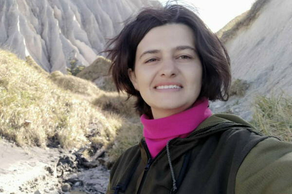 Ольга Бергаль-Кувикас, фото сделано на обнажениях игнимбритов перешейка Ветровой, о. Итуруп, Курильские острова