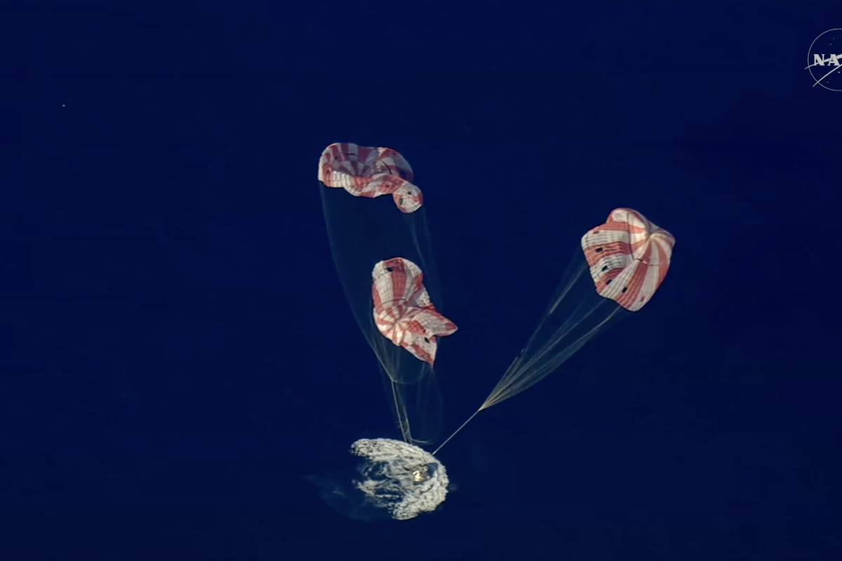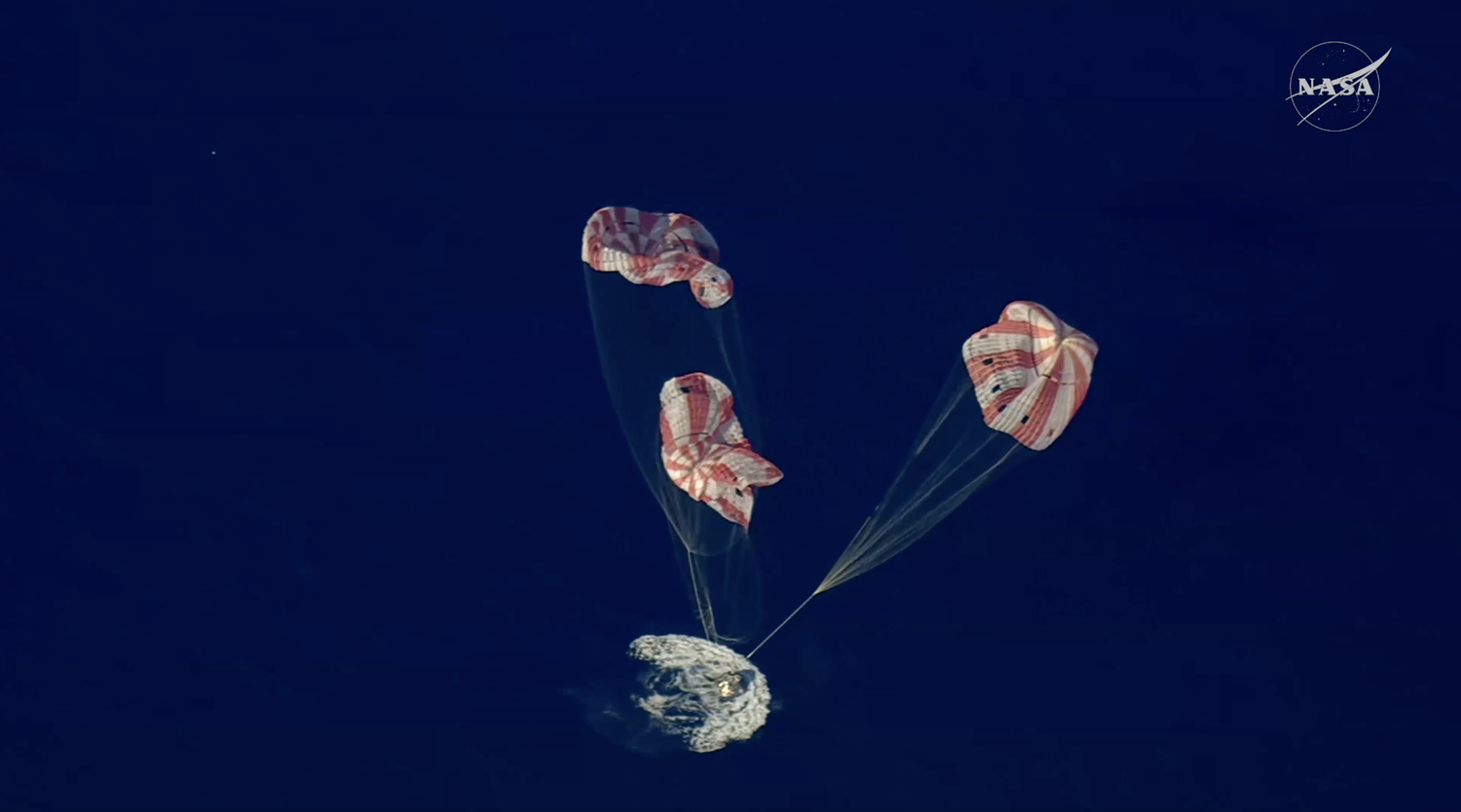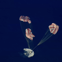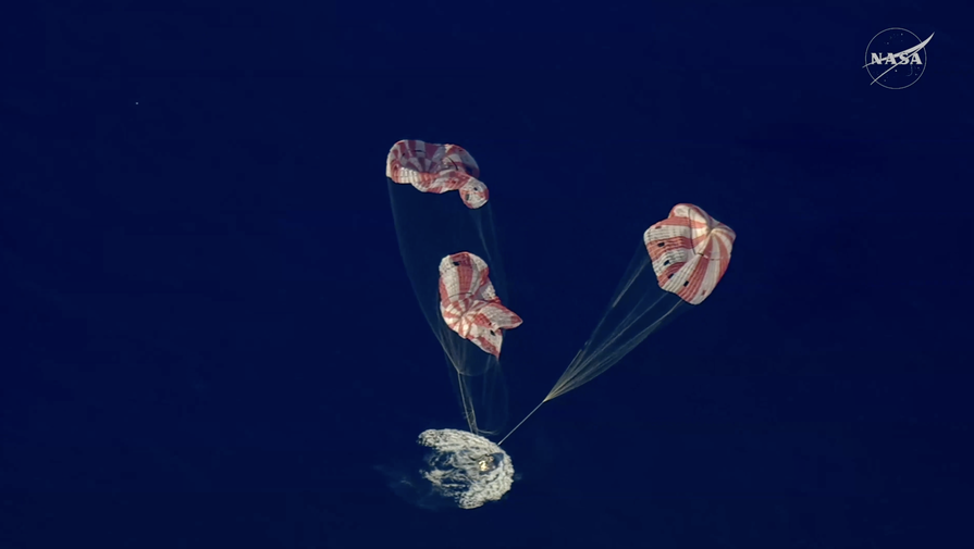 Затем сработали вспомогательные парашюты, которые вытянули три основных купола диаметром более 35 метров. На них скорость снижения уменьшилась до безопасных значений — около 30 км/ч. Именно на этой стадии капсула завершила спуск и приводнилась в океане.