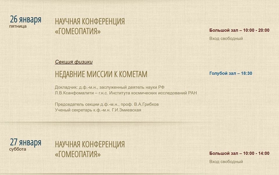 Руководство центрального дома ученых РАН объяснило приглашение гомеопатов на «научную» конференцию. Объявление о проведении конференции 26-27 января размещено на официальной афише ЦДУ, причем в соседнем зале 26 января заявлена конференция «Недавние миссии к кометам», на которой будет выступать главный научный сотрудник ИКИ Леонид Ксанфомалити.