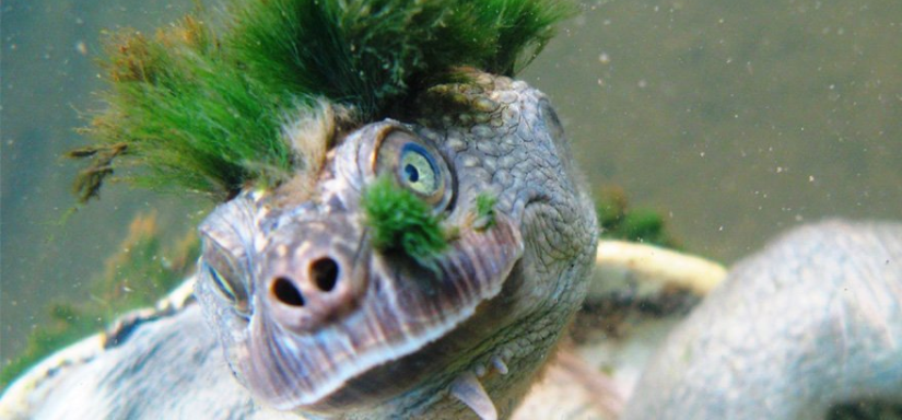 Водяную черепаху длиной 40 см отличают широкие ноздри, «усики» на подбородке, напоминающая ирокез «прическа» из водорослей и умение дышать задней частью тела — вблизи хвоста находятся жабры, позволяющие черепахе проводить под водой до трех дней. Уникальной особенностью мужских особей черепах является хвост, который может составлять две трети длины панциря, и это самый длинный хвост среди всех видов черепах.
