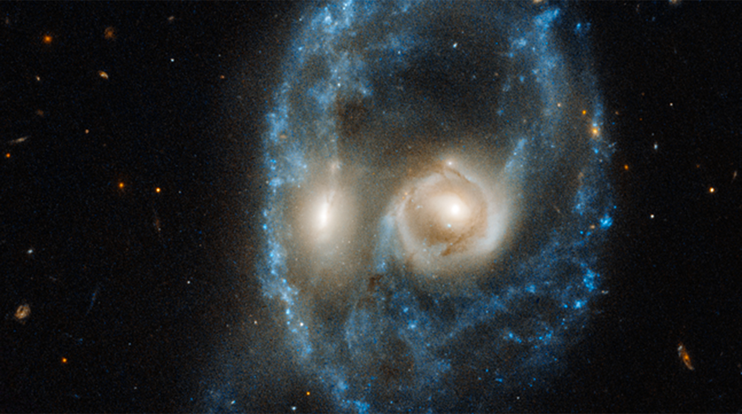 Каждый «глаз» — это яркое ядро галактики, результат того, что одна галактика врезается в другую. Контур лица образован из кольца молодых голубых звезд. Другие скопления новых звезд образуют нос и рот.