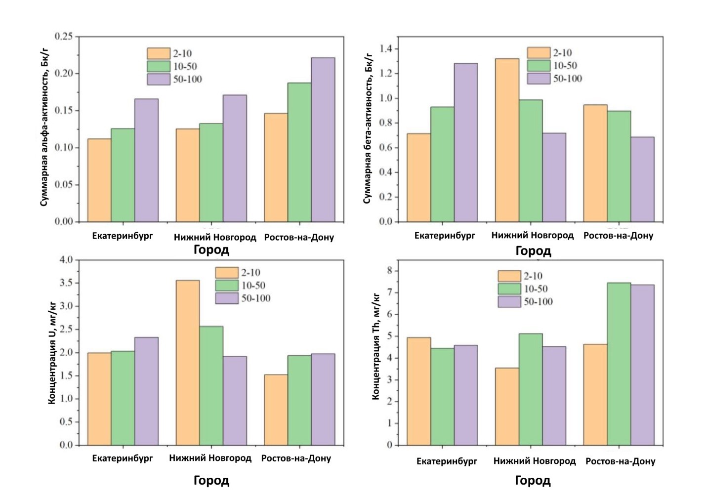 Размер частиц фракций, имеющих максимальную бета-активность, в городах отличался: для Екатеринбурга это также был песок, а для Нижнего Новгорода и Ростова-на-Дону — пыль. По-видимому, эти различия связаны с геологическими особенностями территорий, на которых расположены города. Источниками бета-излучения в пробах оказались природные радий и изотоп калий-40. Следует отметить, что обнаруженные содержания радионуклидов в исследованных компонентах окружающей среды не превышают нормы и не вносят вклада в радиоактивное облучение населения городов.