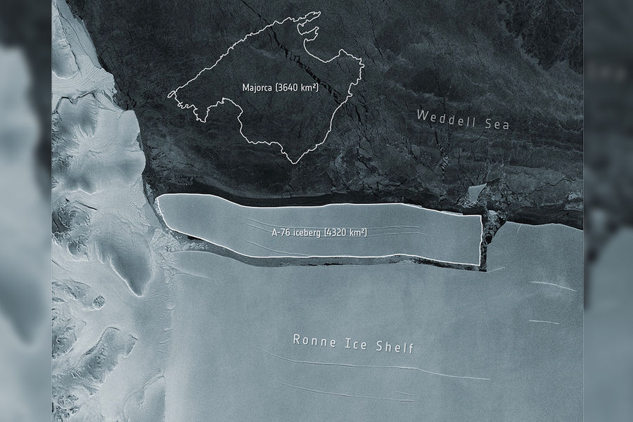 Ранее сообщалось, что от Антарктиды в западной части шельфового ледника Ронне откололся гигантский айсберг общей площадью примерно 4320 квадратных километров. Айсберг получил название «А-76», его длина 170 километров, ширина — 25 километров. На данный момент А-76 находится в море Уэдделла.