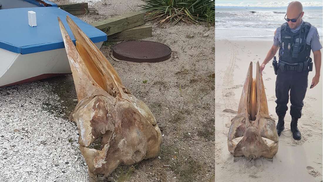 Гигантский череп неизвестного животного выбросило на берег в Нью-Джерси, США. О находке сообщили в соцсетях представители парка Айленд Бич, где полиция его обнаружила.