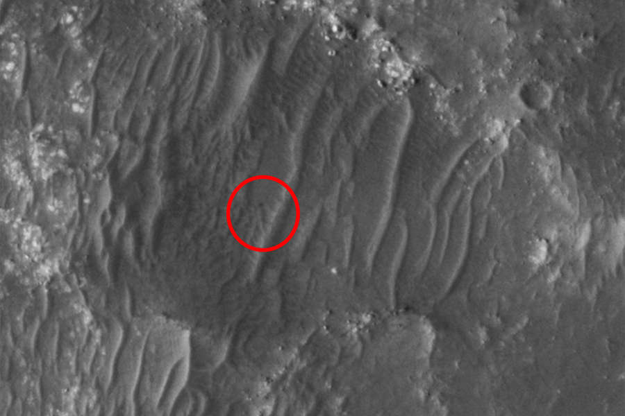 Лаборатория исследования Луны и планет Аризонского университета выложила фотографии марсохода и вертолета, сделанные камерой высокого разрешения HiRise орбитального аппарата Mars Reconnaissance Orbiter. Аппараты находятся в кратере Езеро, древнем марсианском озере. Марсоход виден как светлая точка на фоне расколотой коренной породы скалы Мааз, а вертолет – как темная точка на фоне песчаных дюн. Камера HiRise позволяет делать снимки с разрешением до 30 сантиметров, и потому у Ingenuity, чей фюзеляж примерно достигает 15 сантиметров в ширину, невозможно различить никаких деталей.