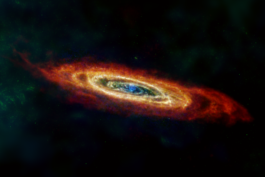 На первом снимке изображена Галактика Андромеды, на втором — Большое Магелланово Облако, а на третьем — Малое. Газообразный водород отображается красным цветом, это самый распространенный элемент во вселенной. Полости в пыли, где молодые звезды сдули ее сильными ветрами, выглядят как пустые области, окруженные зеленым свечением, указывающим на холодную пыль. Синие области представляют собой более теплую пыль, нагретую звездами или другими процессами.