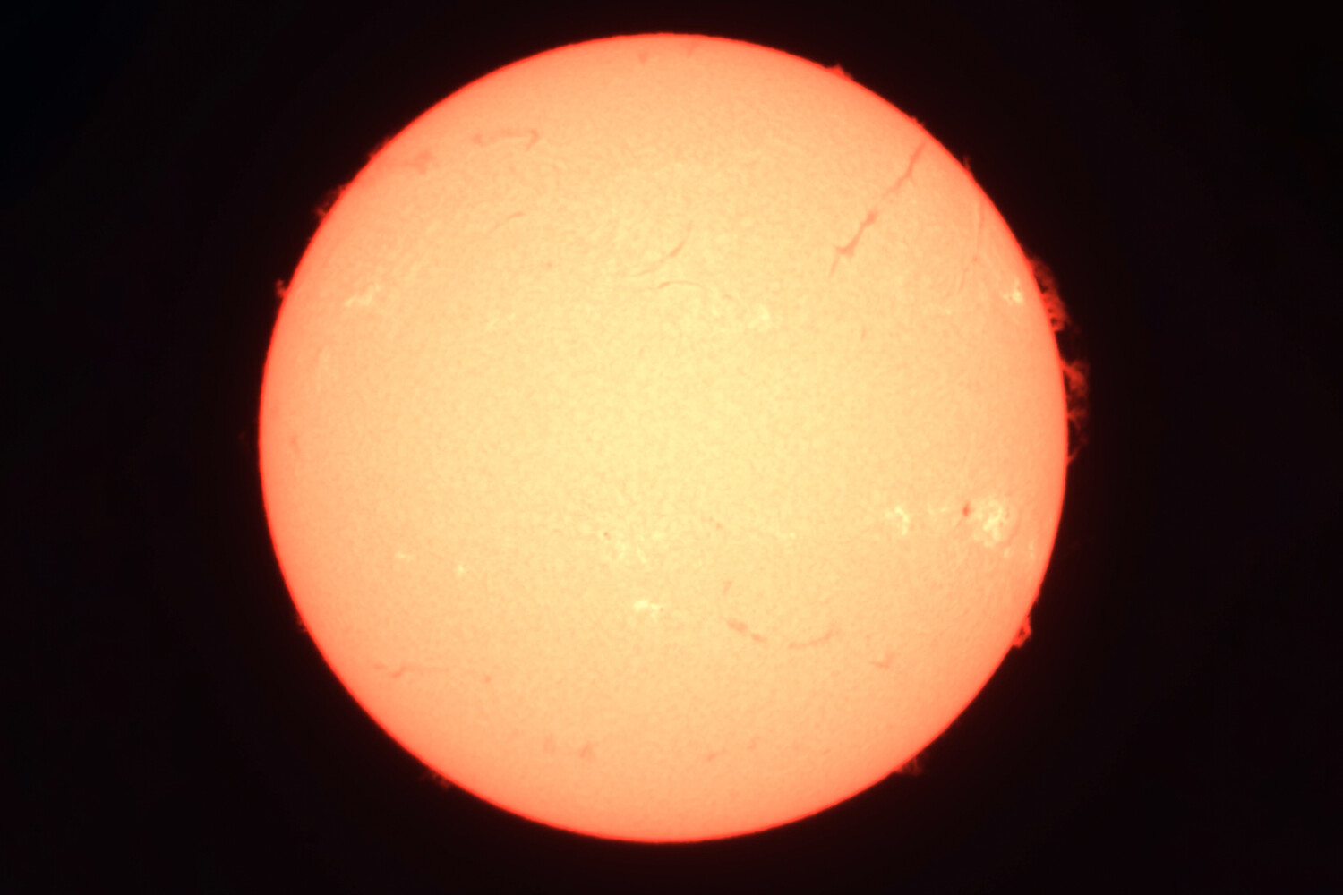 «На лимбе нашего светила видны протуберанцы, а «трещина» сверху — тоже протуберанец, но проецирующийся на солнечный диск», — говорится в сообщении.