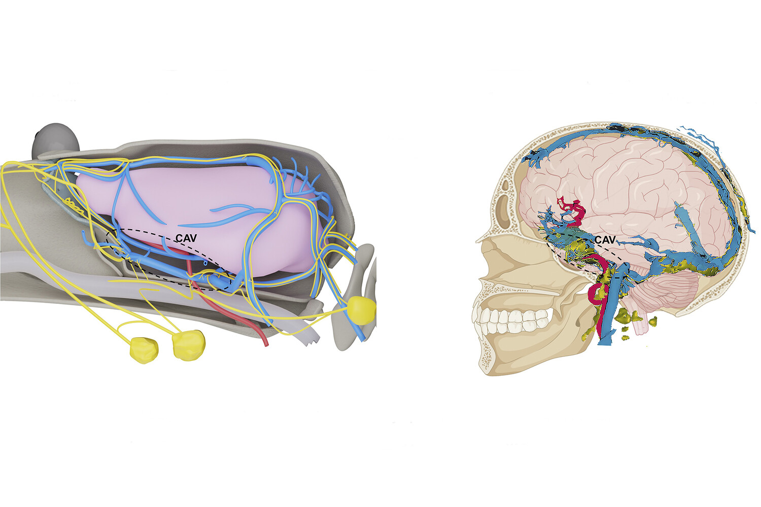 Ученые также нашли обширную менингеальную лимфатическую сеть вокруг кавернозного синуса в передней части черепа. Оттуда менингеальные лимфатические сосуды выходят из черепа в шейные лимфатические узлы.