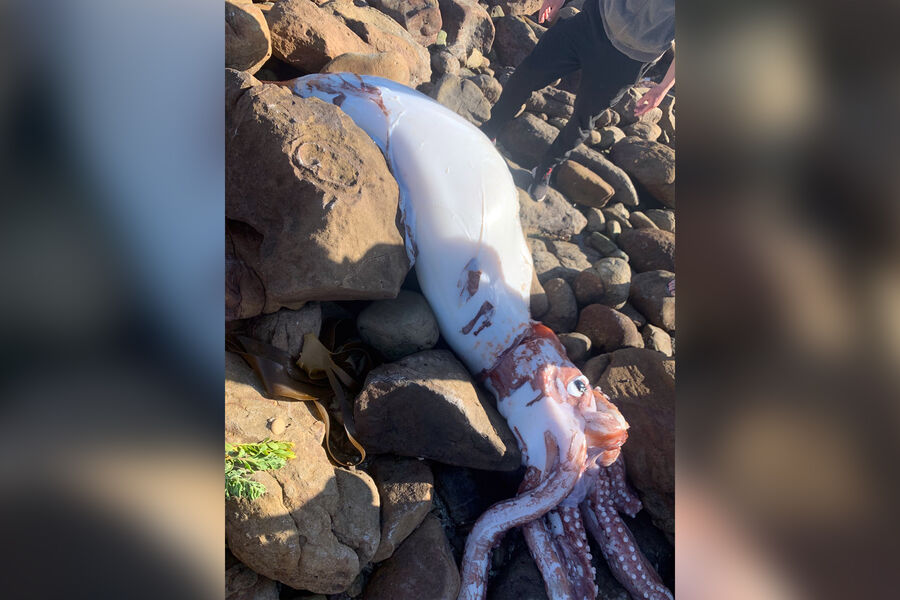 Массивную тушу гигантского кальмара выбросило на скалистый берег пляжа Скарборо в Кейптауне, об этом сообщает местный новостной портал news24.