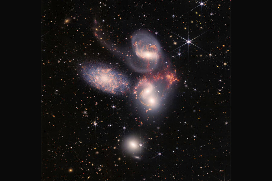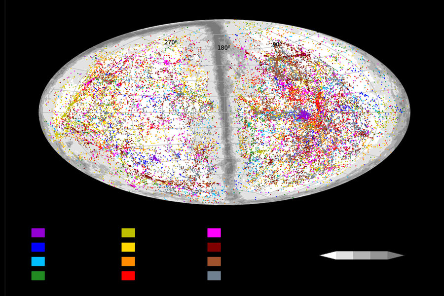 Всего на карту было нанесено около 56 тыс. галактик. Топология карты отражает их расположение на небе, а цвет — расстояние.