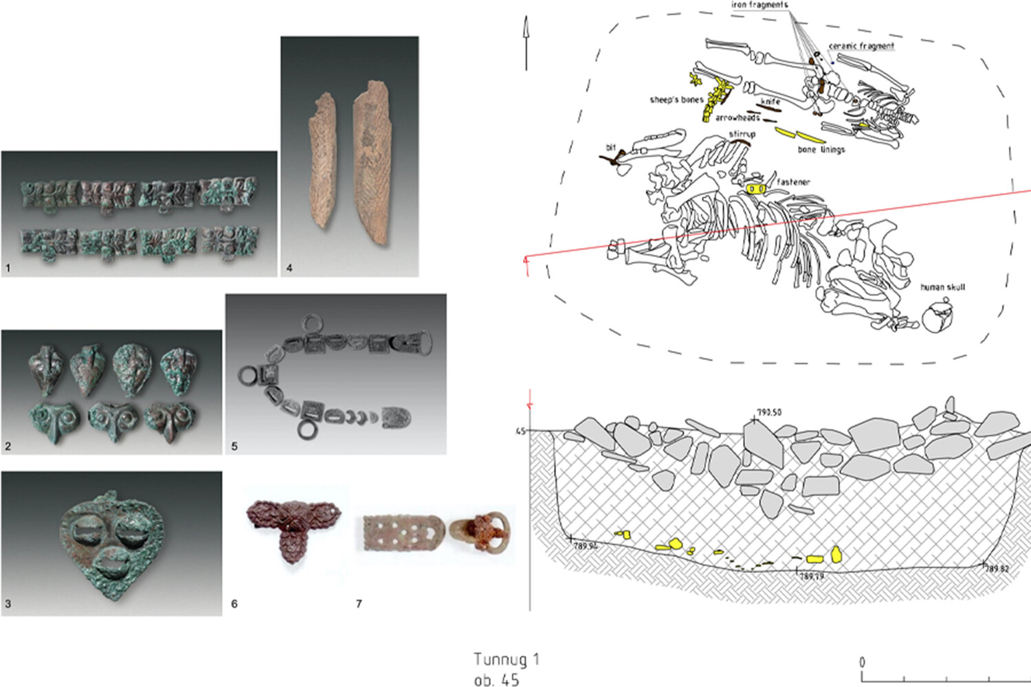 В заполнении ям археологи обнаружили железные наконечники стрел, костяные свистунки, бронзовые пряжки, а также элементы конского снаряжения. При раскопках одного из объектов ученые выявили курган диаметром 4,5 метра. В основной яме этого сооружения археологи не нашли каких-либо останков. Однако в другом погребении находились кости ребенка, а также китайская монета времен династии Тан. Не нашли человеческих останков и при исследовании конструкции-36, однако артефакты под каменной насыпью все же присутствовали. Так, в руки ученых попали железные элементы узды, стремена, пряжки и наконечники стрел. Напротив, при раскопках объектов 37 и 38 археологи обнаружили только детские останки и кости мелкого рогатого скота. В другом захоронении лежал 8-9-летний ребенок и молодая лошадь, а также одно железное стремя, элементы узды, нож, три наконечника стрел, а также костяные пряжки и рукояти. Кроме того, под насыпью присутствовали фрагменты черепа и позвонки самки косули, а также останки собаки, которая при жизни достигала в высоту 40 сантиметров и весила около 10–15 килограмм.