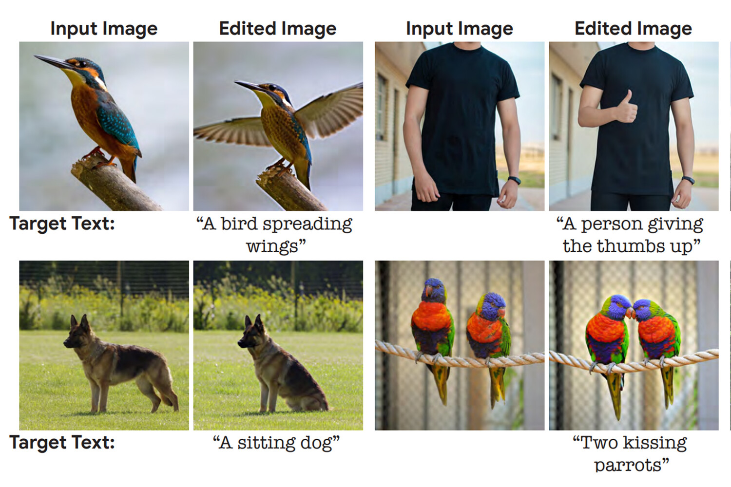 Теперь Михаль Ирани из компании Google и его коллеги создали систему редактирования изображений, работающую на схожем принципе. Работа программы состоит из трех этапов. Человек загружает исходное изображение и пишет текстовое описание, что с ним надо сделать, например, фотографию сидящей птицы и текст «летящая птица». На первом этапе эта фраза превращается в эмбеддинг, а затем оптимизируется так, чтобы сгенерированное на его базе изображение было похоже на исходное. На втором этапе уже сама диффузионная генеративная нейросеть оптимизируется так, чтобы в ответ на оптимизированный эмбеддинг генерировать изображения, похожие на оригинал. А на третьем этапе происходит линейная интерполяция между исходным и оптимизированным эмбеддингами, а результат подается на оптимизированную нейросеть. Тесты показали, что такая схема позволяет менять только нужные детали на изображении и оставляет в практически неизменном виде остальные.