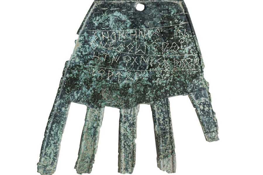 Находку сделали на территории археологического памятника Ирулеги в 8 километрах от Памплоны в регионе Наварра. Он непосредственно примыкает к Стране Басков, и на этой территории также проживает много представителей этого народа. Рука лежала неподалеку от стен средневекового замка, в древнем поселении возрастом 2000 лет. На пороге одного из домов лежала бронзовая пластина длиной 14 сантиметров, произведенная в I веке до нашей эры и напоминающая человеческую руку. Ее тыльная сторона была исписана непонятными символами, или письменами, также имелось отверстие для подвешивания — вероятно предмет играл ту же роль, что в позднейшую эпоху висящая над дверью подкова.