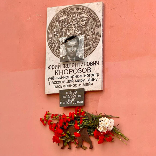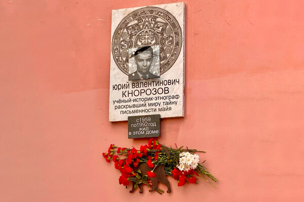 В Санкт-Петербурге установили памятную доску Юрию Кнорозову, дешифровавшему письменность майя, с изображением ацтекского камня. Об этом сообщил доцент Мезоамериканского центра им. Ю.В. Кнорозова РГГУ Дмитрий Беляев на личной странице VK.