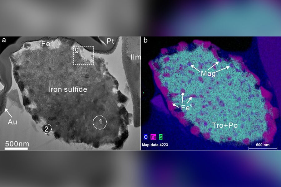Исследованный магнетит содержится в сферических зерна сульфида железа диаметром менее 2 микрон. В этих сферах по краям располагались тонкие нити чистого железа, а по всему объему были размешаны субмикроскопические частицы магнетита. Это удалось выяснить с помощью просвечивающей электронной микроскопии.