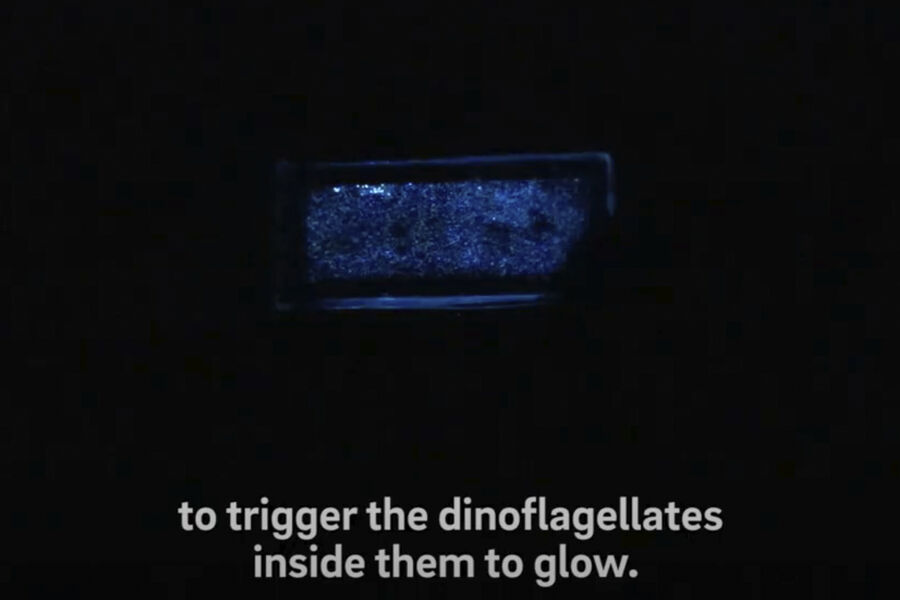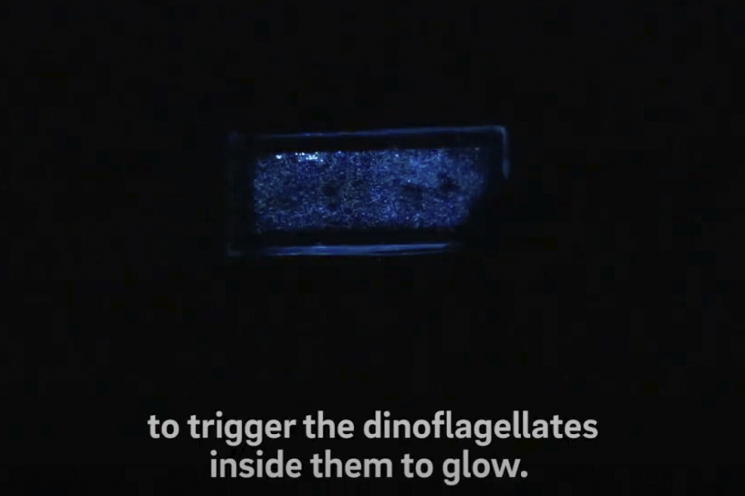Когда материалы подвергаются сжатию, растяжению или скручиванию, находящиеся в них динофлагелляты реагируют излучением света. Эта реакция имитирует то, что происходит в океане, когда водоросли производят вспышки света для защиты от хищников.