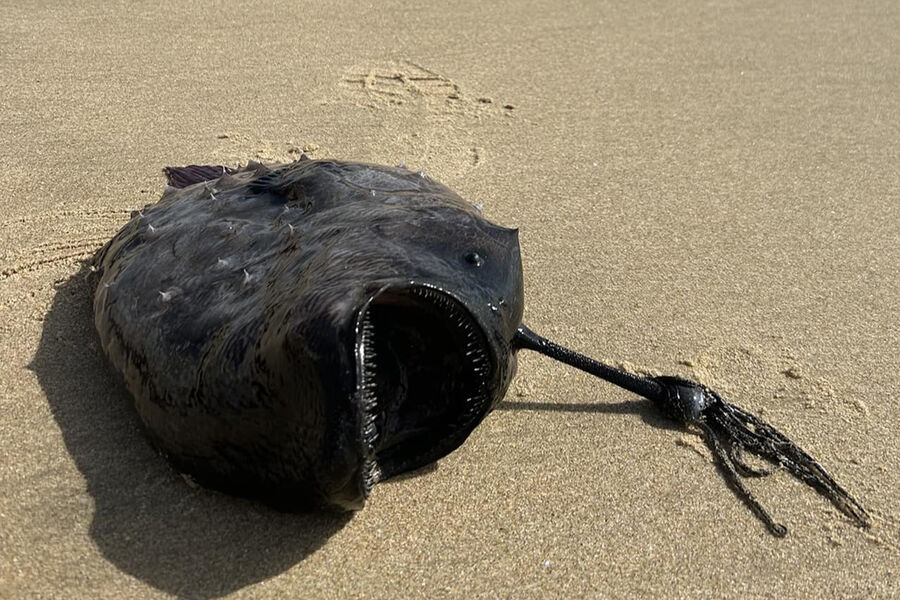 Тихоокеанская футбольная рыба (Himantolophus sagamius) — один из более чем 300 видов удильщиков, обитающих в глубоководных водах по всему миру. Черную рыбу длиной 36 сантиметров со стеблем на голове в октябре 2023 года выбросило на пляж парка Кристал-Коув в Южной Калифорнии.
