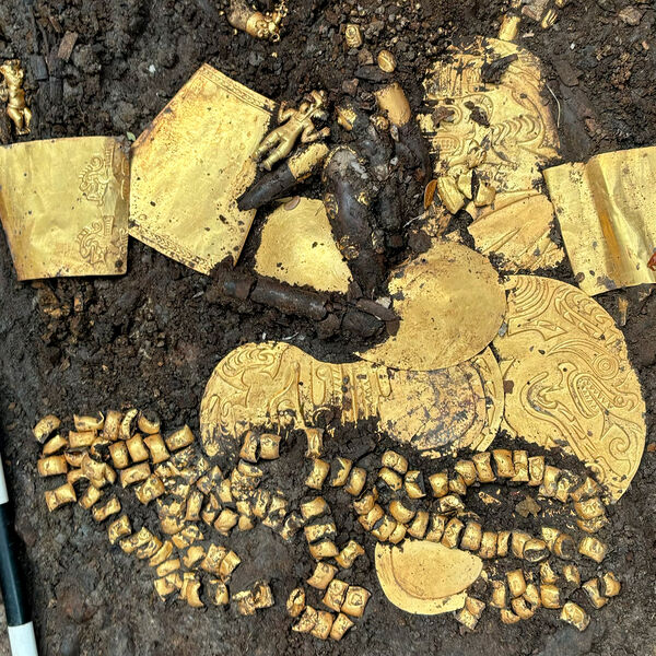 По словам археологов, в гробнице правителя нашли золотые монеты, пять декоративных нагрудников пекторалей, два пояса из круглых золотых бусин, четыре браслета, пару серег с изображениями мужчины и женщины. Также были обнаружены серьга в виде двух крокодилов, серьги из позолоченных зубов кашалота, круглые золотые пластины, набор костяных флейт, браслеты и юбки из собачьих зубов наряду с керамическими изделиями и другими артефактами.
