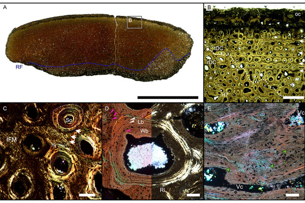 Стенки образцов содержали длинные нити окаменевшего коллагена, делая их похожими на материалы, армированные углеродным волокном. Такие кости могли очень быстро расти, не теряя стабильности.