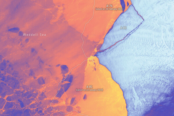 Рождение A-83 зафиксировали спутники наблюдения за Землей Copernicus Sentinel-1 ЕКА и Landsat-8 NASA.