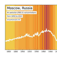 Команда разработала диаграммы, показывающие атмосферные концентрации микропыли PM 2.5 в столицах стран мира за период с 1850 по 2021 год.