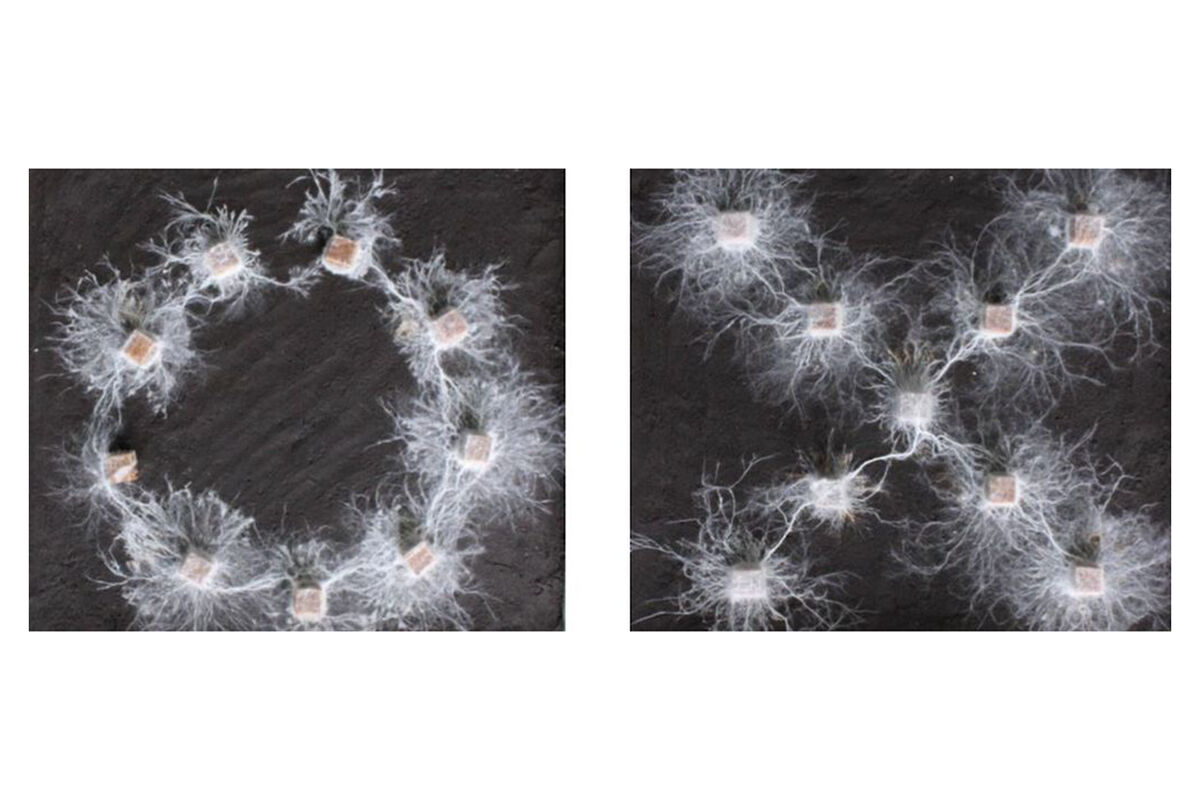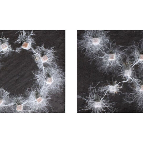 Специалисты разместили девять колонизированных Phanerochaete velutina деревянных брусков в двух конфигурациях: кольцом или крестом. Затем ученые наблюдали, как организмы распространяют усики мицелия, изучая местность.