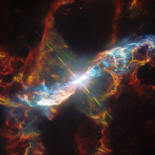 Группа астрономов с помощью космического телескопа «Хаббл» запечатлела туманность в форме песочных часов, окружающую звездную систему R Водолея в одноименном созвездии. В ней находится одна из самых турбулентных звезд в нашей галактике. Исследование опубликовано на официальном сайте орбитальной обсерватории.