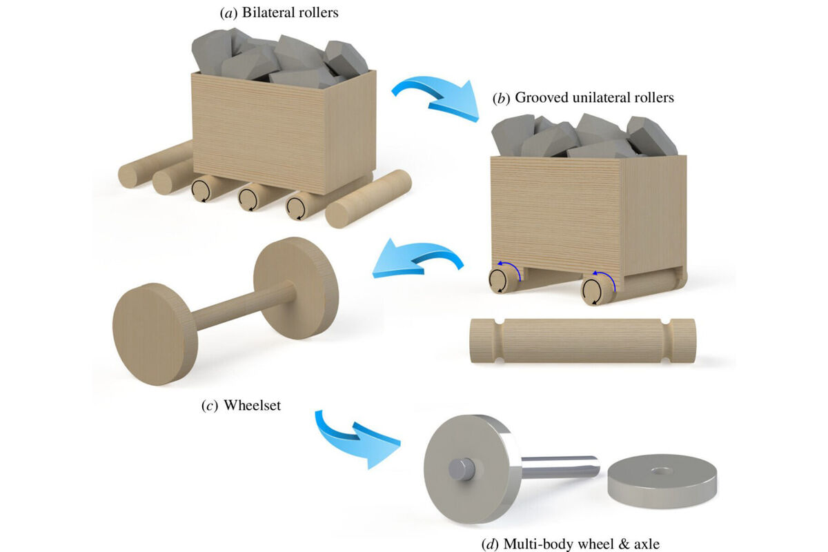 Как показало моделирование, в какой-то момент люди дополнили катки канавками, которые не давали прообразу вагонетки соскользнуть с ролика.