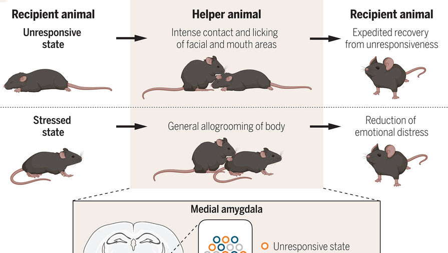С помощью методов кальциевой визуализации и оптогенетики ученые выяснили, что нейроны в миндалевидном теле (MeA) играют ключевую роль в таком поведении. Эти нейроны различают бодрствующих и седированных сородичей. Когда активность нейронов MeA подавлялась, мыши переставали ухаживать за обездвиженными особями. Напротив, стимуляция этих нейронов усиливала просоциальное поведение.
