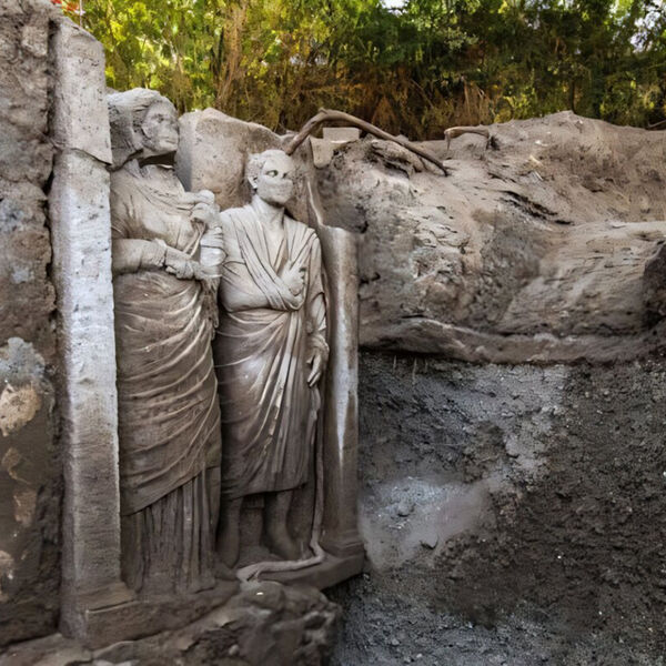 На этот раз внимание исследователей привлекла монументальная гробница, увенчанная реалистичными скульптурами мужчины и женщины в полный рост. Они стоят рядом, но не касаются друг друга. Женщина изображена чуть выше мужчины и облачена в традиционные римские одеяния — тунику, плащ и вуаль, подчеркивающие ее статус. В руке — лавровая ветвь, которую жрицы использовали во время ритуалов.
