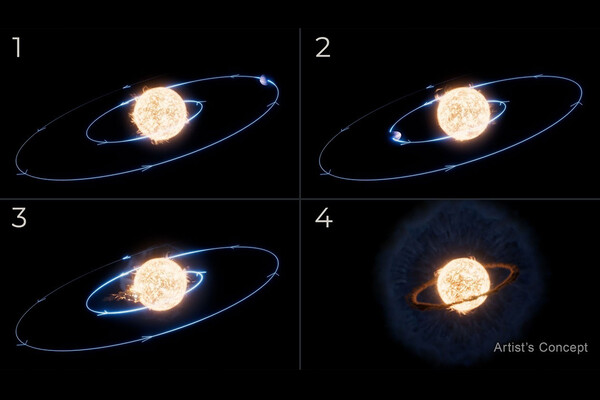 Столкновение породило мощные выбросы пыли и горячего газа, окружившие звезду расширяющимся облаком в виде кольца.