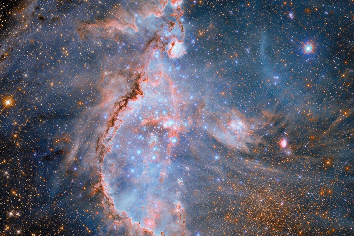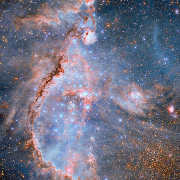 Этот снимок объединяет данные космического телескопа «Хаббл» в инфракрасном, оптическом и ультрафиолетовом диапазонах, что позволило ученым получить наиболее полную картину этой «фабрики звездообразования».