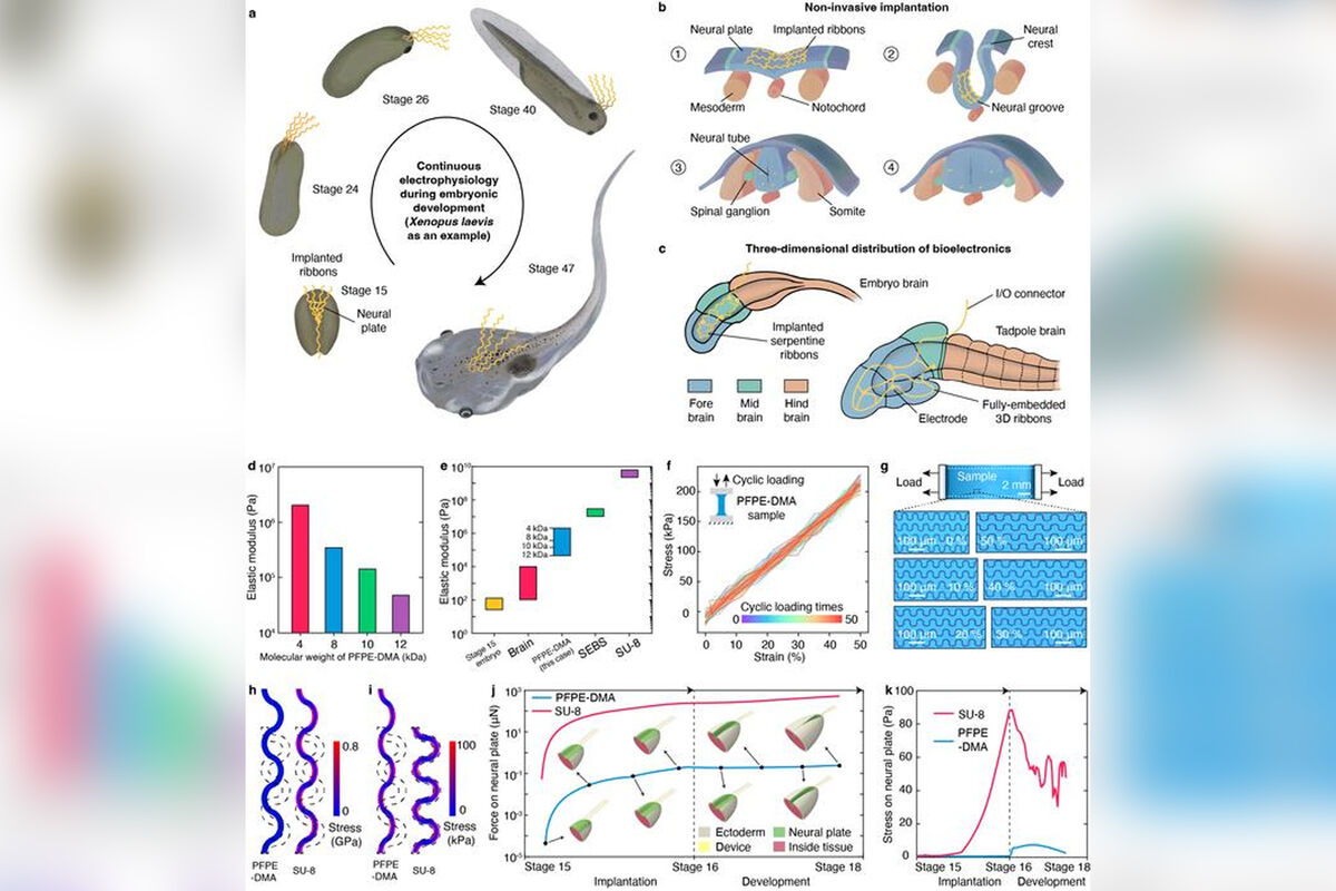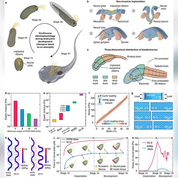 Исследователи из Гарвардской школы инженерии и прикладных наук имени Джона А. Полсона разработали тонкое, мягкое и растягиваемое биоэлектронное устройство, которое можно имплантировать в нервную пластинку головастика — раннюю плоскую структуру, из которой формируется мозг и спинной мозг. Работа опубликована в журнале Nature.