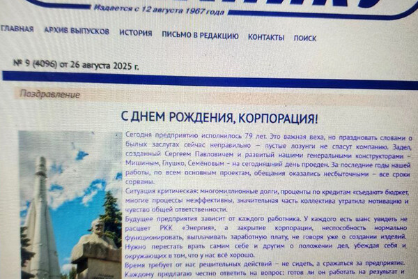 Ранее генеральный директор РКК «Энергия» Игорь Мальцев в обращении к сотрудникам по случаю 79-летия предприятия сообщил о критической ситуации, в которой оказалась компания, предрекая ее вероятное закрытие.