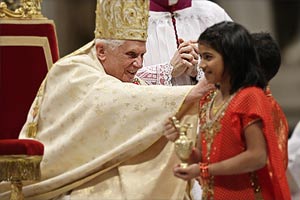 В ночь на четверг в Ватикане папа римский Бенедикт XVI провел главную рождественскую мессу. Понтифик Йозеф Ратцингер обратился к католикам всего мира со словами молитвы и благословения четвертый раз за время своего пребывания в сане. Месса проходила в соборе Святого Петра на итальянском языке. Перед службой папа благословил верующих из окна своей резиденции в Ватикане, которая находится как раз напротив главного католического собора, и зажег на подоконнике свечу мира.