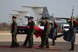 Солдаты ВВС, ВМФ и Сухопутных войск торжественно промаршировали перед польским военным самолетом «Каса». После того как российский премьер и посол Польши в России с красными розами и склоненными головами встали у красной ковровой дорожки, из тонированного микроавтобуса Ford вынесли тело Качиньского. Российские военные едва не уронили массивный закрытый гроб на подходе к небольшому красному подиуму с траурной каймой: из рук одного из солдат, шедшего сзади, выскользнула ручка. После досадного инцидента гроб водрузили на постамент, российский премьер и польский посол, переглянувшись, положили розы на крышку, покрытую национальным флагом Польши. У польской журналистки никак не получалось снять происходящее на небольшую фотомыльницу — дрожали руки. Опустив фотоаппарат, она принялась вытирать бегущие по щекам слезы. Плакали и члены польской делегации. Российские министры — глава МВД Рашид Нургалиев, руководитель Минтранса Игорь Левитин, глава МЧС Сергей Шойгу, а с ними руководитель СКП Александр Бастрыкин — стояли чуть позади премьера Путина, склонив головы.