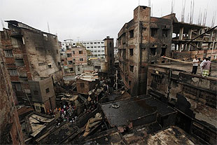 Представители пожарного департамента Дакки говорят, что быстрому распространению пламени способствовало то, что многие магазины, расположенные в этом районе, торгуют легковоспламеняющимися товарами из пластика. Кроме того, тут же находилась пекарня, оборудованная газовыми плитами. Улицы в старом городе узкие, поэтому отрезать пламя долго не удавалось. «Все кругом горело и плавилось, как будто началось извержение вулкана, — вспоминает один из выживших. — Бежать было некуда — всюду огонь». Пламя поднималось до шестого этажа, охватило крыши.